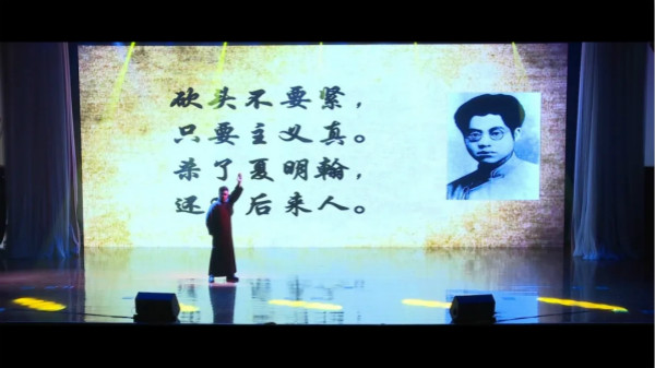 話劇是一場時空穿越。對夏明翰的演繹,本可以更加雄偉壯闊,但我傾向加入了淚聲和嗚咽,因為我腦海中的夏明翰絕不只是一個“高大全”的革命烈士,他也是有血有肉的人。他在給母親寫下“別用淚水送兒離人間”的時候,他心中也必定有萬千不舍,但還是在生命最后一刻,走入了追求革命理想、追求真理永存的大義,他的形象因為豐富人性的襯托而更加偉大?!皻⒘讼拿骱?,還有后來人”——夏明翰也因此獲得了永恒的生命。這句話的悲壯恰恰證明了,共產黨人絕非形單影只、絕非單打獨斗,我們是一個集體、乃至是一個共同體,這個共同體因橫向的團結而獲得力量,因縱向的傳承而達至永久。我們慶幸自己能成為這個共同體的一部分。無論將來我在世界哪個角落,不管身處戰亂還是艱苦,只要心中有黨,就永不會迷失方向;只要心中有理想信念,就有摧山的磅礴力量。