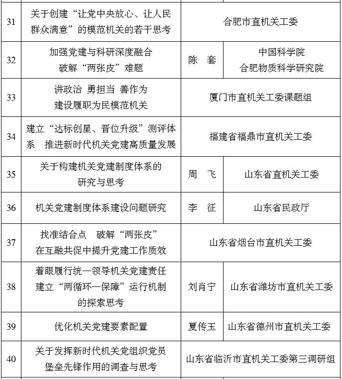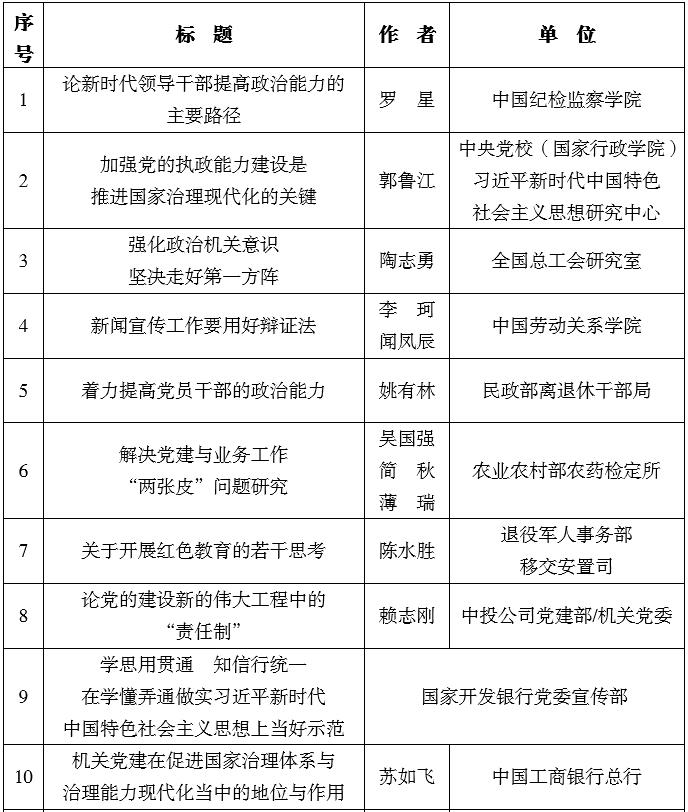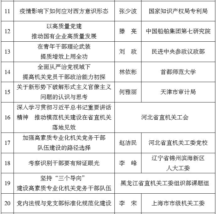 為引導各級機關黨組織深入學習貫徹習近平總書記在中央和國家機關黨的建設工作會議上的重要講話精神,研究解決機關黨建重點、難點、熱點問題,切實發揮好理論對實踐的指導作用,推動機關黨建高質量發展,機關黨建研究雜志社自2020年3月起開展了理論征文活動。截至活動結束,共收到征文600余篇。按照公開、公平、公正原則,雜志社組織評審組經過初評和終評兩個環節對征文進行了評定。根據評審情況,評出60篇優秀理論征文,名單如下。