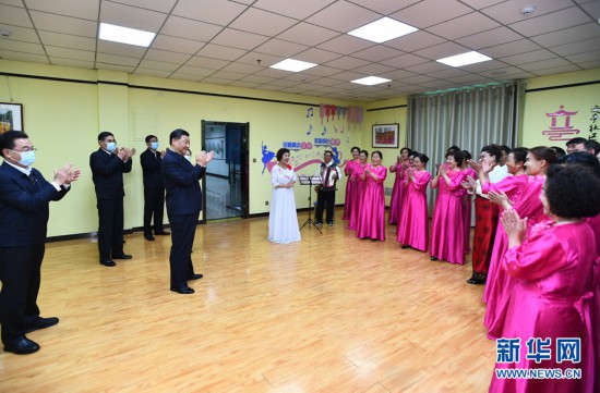 6月7日至9日,中共中央總書記、國家主席、中央軍委主席習近平在青??疾?。這是7日下午,習近平在西寧市城西區文匯路街道文亭巷社區舞蹈室,觀看退休人員歌曲排練。新華社記者 謝環馳 攝