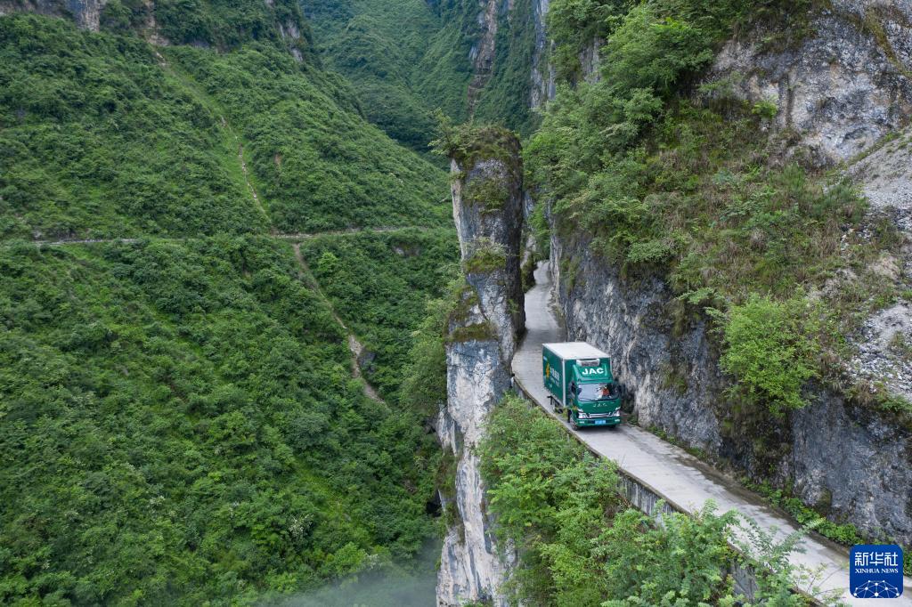 郵車行進在通往四川省漢源縣永利鄉古路村的山路上(6月23日攝,無人機照片)。新華社記者 江宏景 攝