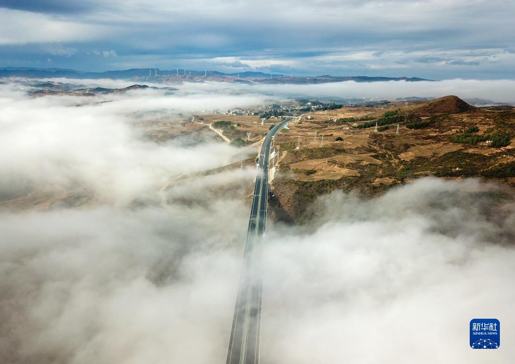 云霧中的貴州省六威高速公路觀風海大橋(2018年12月19日攝,無人機照片)。新華社發(何歡 攝)