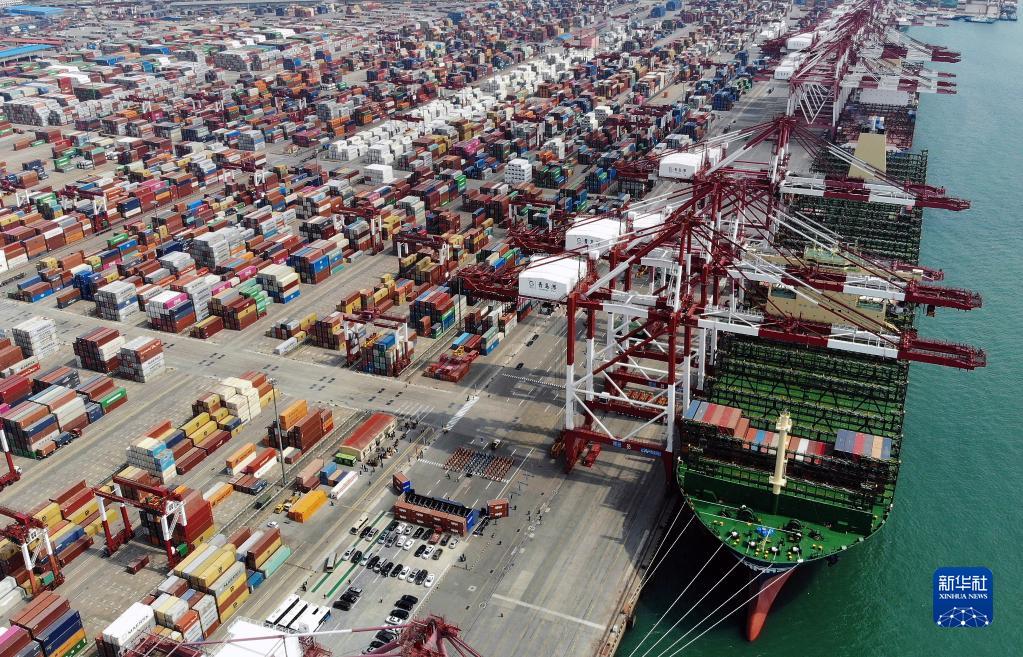 載箱量可達2.4萬標準箱的“現代商船阿爾赫西拉斯”輪靠泊在青島港前灣碼頭(2020年4月26日攝,無人機照片)。新華社記者 李紫恒 攝