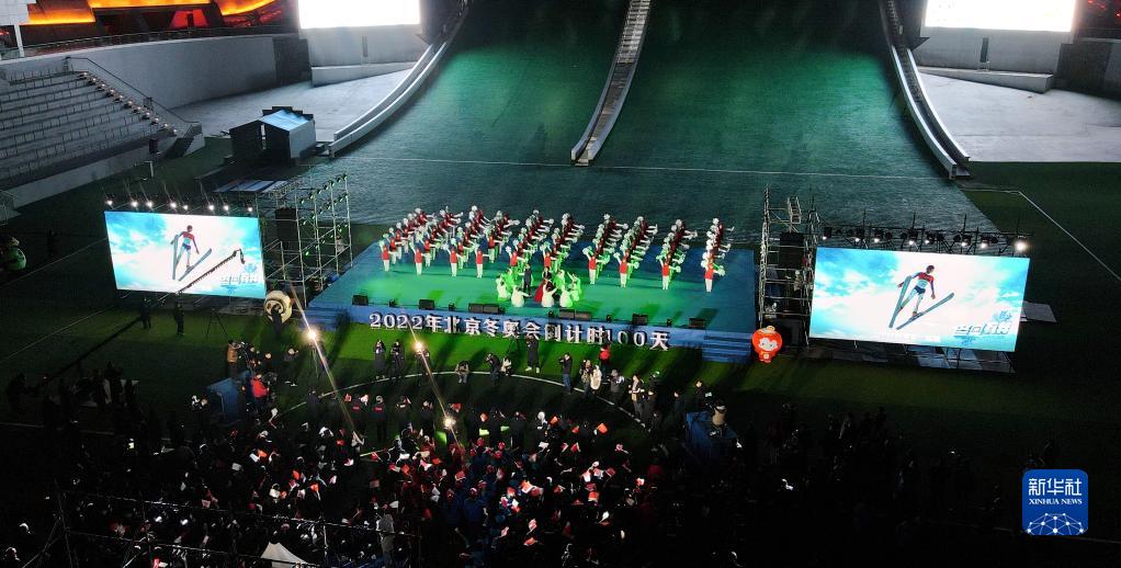 10月26日,“來自崇禮的邀約”——北京2022年冬奧會倒計時100天慶?;顒釉诤颖笔埣铱谑谐缍Y區國家跳臺滑雪中心“雪如意”舉行(無人機照片)。新華社記者 金皓原 攝