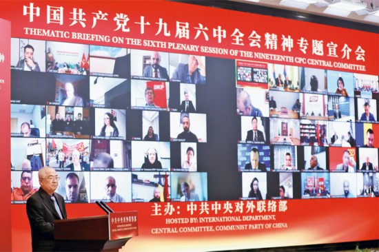 2021年11月19日,中共中央對外聯絡部以線上線下相結合的方式舉辦中共十九屆六中全會精神專題宣介會。來自全球160多個政黨和組織機構的500多位代表以及近100位在京駐華使節出席。圖為中方專家在北京作宣講。 中新社記者 蔣啟明/攝