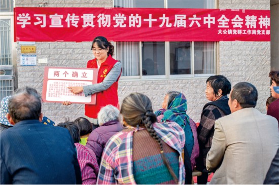 2021年11月18日,江蘇省南通市海安市大公鎮黨員志愿者在常河村12組向村民宣傳黨的十九屆六中全會精神,用老百姓聽得懂、能領會的方式將全會精神傳達到基層。 人民視覺 翟慧勇/攝