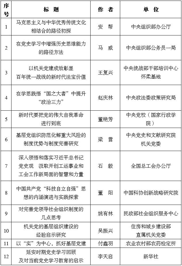 為慶祝中國共產黨成立100周年,深入總結和學習運用百年來機關黨建的歷史經驗,準確把握機關黨建工作特點規律,進一步做好機關黨建理論研究與交流工作,機關黨建研究雜志社自2021年4月起開展了理論征文活動。截至活動結束,共收到征文400余篇。按照公開、公平、公正原則,雜志社組織評審組經過初評和終評兩個環節對征文進行了評定。根據評審情況,評出50篇優秀理論征文,名單如下。