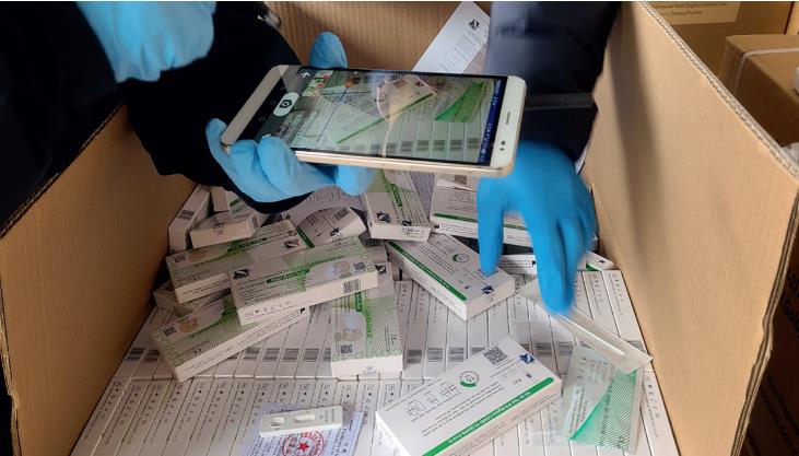 >> 1月17日,在浦東國際機場一處出口商品查驗點,中國海關關員拍攝出口法國的新冠病毒抗原檢測試劑包裝盒。
