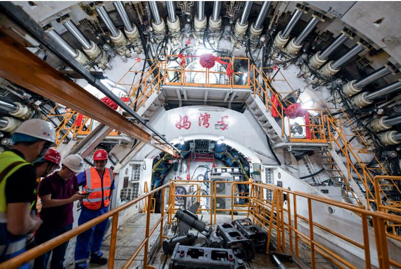 >> 2021年7月15日,在深圳媽灣跨海通道工程建設現場,工作人員在“媽灣號”盾構機旁工作。