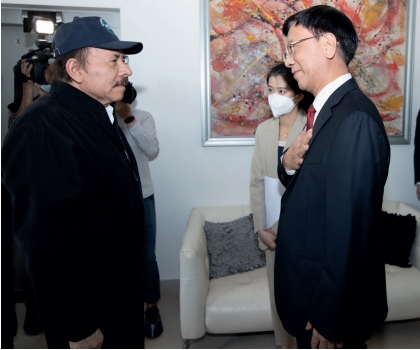 >>當地時間2022年1月10日,習近平主席特使、全國人大常委會副委員長曹建明 (右) 在尼加拉瓜首都馬那瓜會見尼加拉瓜總統奧爾特加。