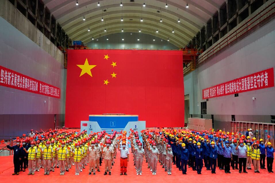 >> 2021年6月28日,在金沙江白鶴灘水電站左岸地下廠房,建設者參加白鶴灘水電站首批機組投產發電儀式。