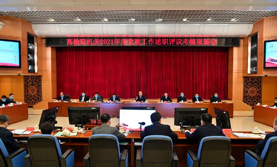 >> 最高人民檢察院機關連續三年舉行黨建工作述職評議,充分發揮黨建引領和保障作用,推動黨建與檢察業務深度融合。圖為2021年度黨建工作述職評議考核現場會。