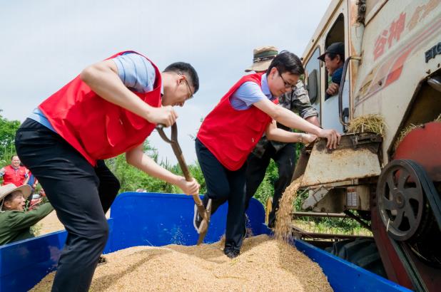 >> 威海市直機關黨員幫助村民搶收小麥。