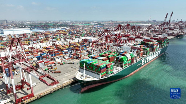 山東港口青島港前灣港區,集裝箱貨輪在碼頭裝卸集裝箱(2022年6月15日攝,無人機照片)。新華社記者 李紫恒 攝