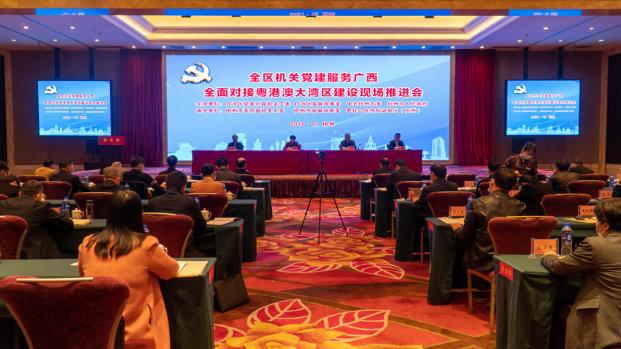 >> 全區機關黨建服務廣西全面對接粵港澳大灣區建設現場推進會會場。