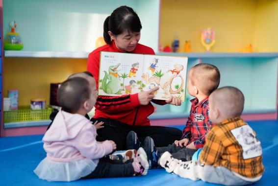 >> 各地兒童福利機構積極推進優化提質,打造養育、治療、康復、教育和社會工作專業化服務一體化發展。圖為寧夏兒童福利院護理部海霞媽媽在嬰幼兒撫育室面向殘疾兒童開展早期教育訓練,提升孤殘兒童智力水平。