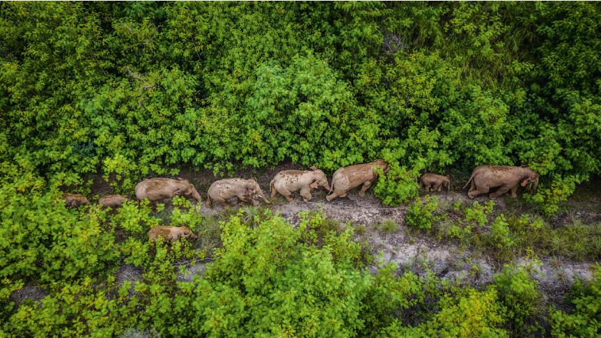 云南亞洲象群南歸。這是二O二一年八月九日在云南省玉溪市元江縣境內拍攝的象群(無人機照片)。