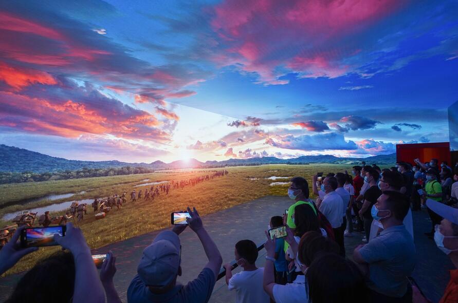 2021年7月15日,觀眾在中國共產黨歷史展覽館“‘不忘初心、牢記使命’中國共產黨歷史展覽”上觀看紅軍長征過草地場景視頻。