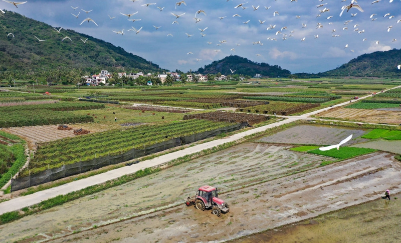 ↑海南省陵水黎族自治縣光坡鎮的農民在田間勞作(2021年4月5日攝,無人機照片)。