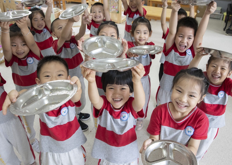 ↑浙江省諸暨市濱江幼兒園小朋友在午餐時比賽誰吃得最干凈(2021年10月14日攝)。