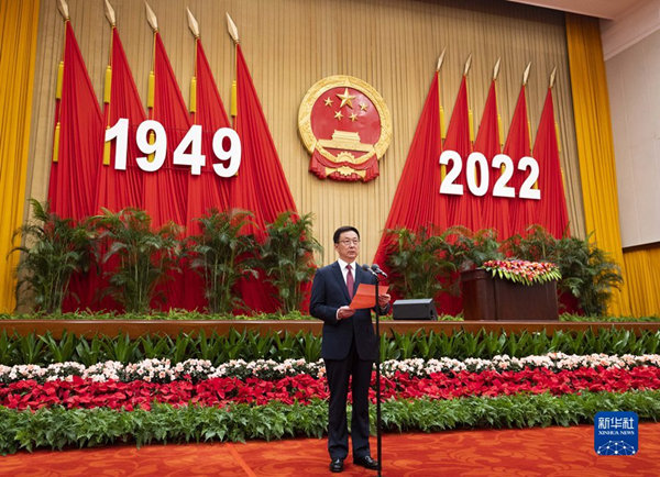 人民大會堂宴會廳華燈璀璨、鮮花綻放,洋溢著喜慶熱烈的節日氣氛。主席臺上方,莊嚴的國徽高懸,“1949-2022”的大字年號在鮮艷的紅旗映襯下格外醒目。