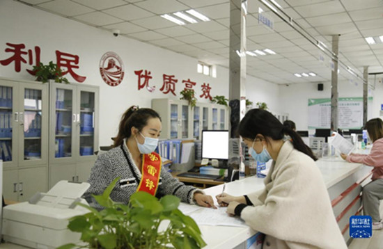 在吉林省長春市二道區政務服務中心輔助填報區,市民在工作人員的輔助下進行事項填報(2020年11月23日攝)。新華社記者 許暢 攝