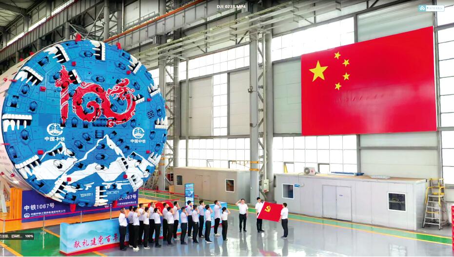 2021年7月1日,中鐵裝備黨員在國產首臺高原高寒大直徑硬巖掘進機雪域先鋒號前重溫入黨誓詞。