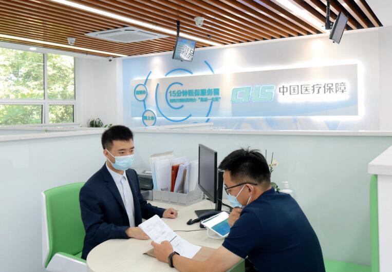 2022年5月6日,江蘇省南京市江北新區泰山街道“15分鐘醫保服務圈”示范點工作人員為群眾辦理醫保業務。