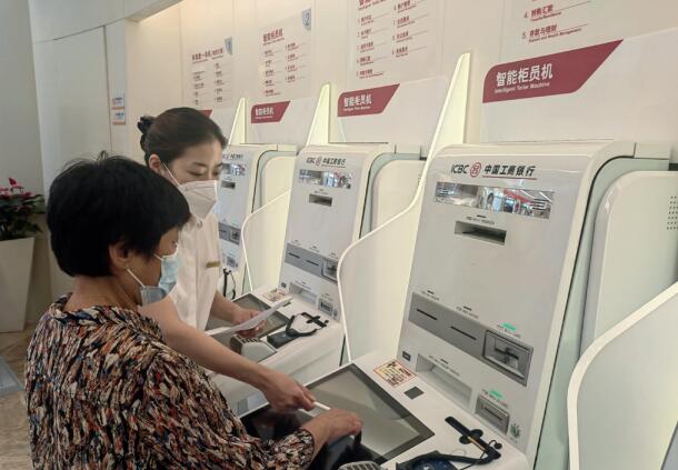 工商銀行北京分行客戶服務經理輔助老年客戶使用自助設備。