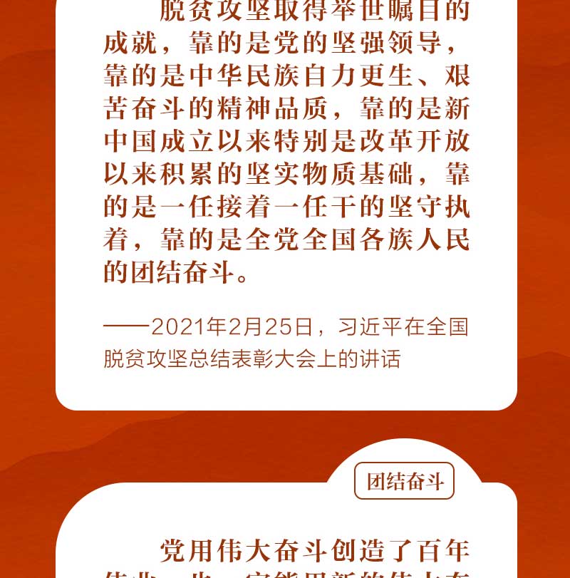 團結才能勝利,奮斗才會成功。黨的十八大以來,我們黨緊緊依靠人民,穩經濟、促發展,戰貧困、建小康,抗大災,應變局、化危機,攻克了一個個看似不可攻克的難關險阻,創造了一個個令人刮目相看的人間奇跡。中國共產黨體察民情,了解民意,把握民心,緊緊依靠人民團結奮斗,戰勝了一個又一個困難,取得了一個又一個勝利。