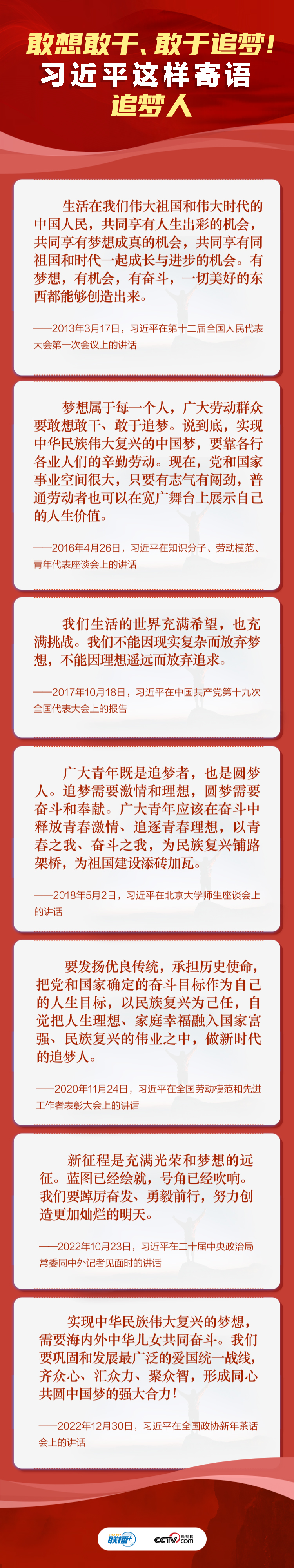 2023年是全面貫徹黨的二十大精神的開局之年,讓我們一起聆聽習近平總書記關于“夢想”的寄語,敢想敢干,以更加奮發有為的姿態奮進前行。