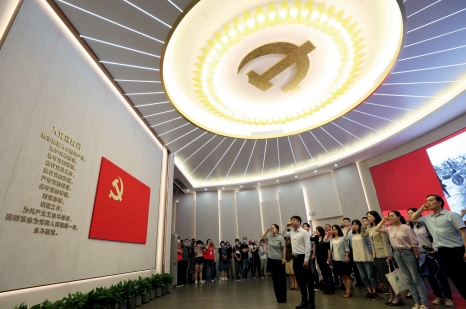 >> 黨員在上海中共一大紀念館里重溫入黨誓詞。