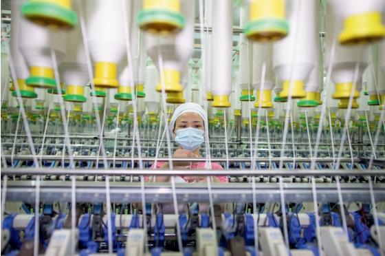 >> 2022年7月15日,江蘇省海安市南莫鎮一家紡織公司生產車間內,工人在生產線上工作。