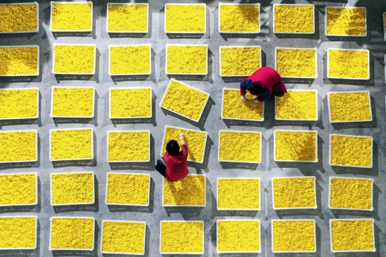 >> 村民在貴州省貴定縣云霧鎮一菊花加工車間攤晾金絲皇菊。