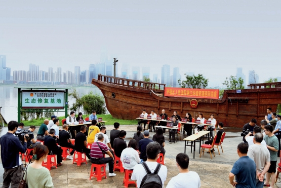 >> 湖南長沙開福區法院下湘江環境資源法庭在湘江之畔巡回審理環境公益訴訟案。