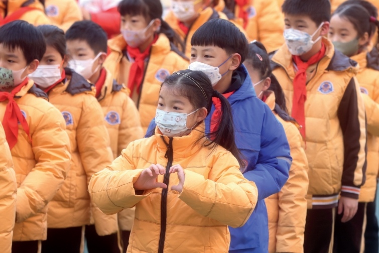 >> 3月23日,教育部發布,2022年,九年義務教育鞏固率為95.5%,比上年提高0.1個百分點。圖為2023年2月13日,北京的小學生參加開學典禮。