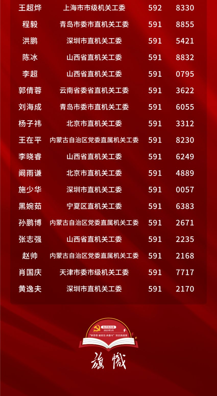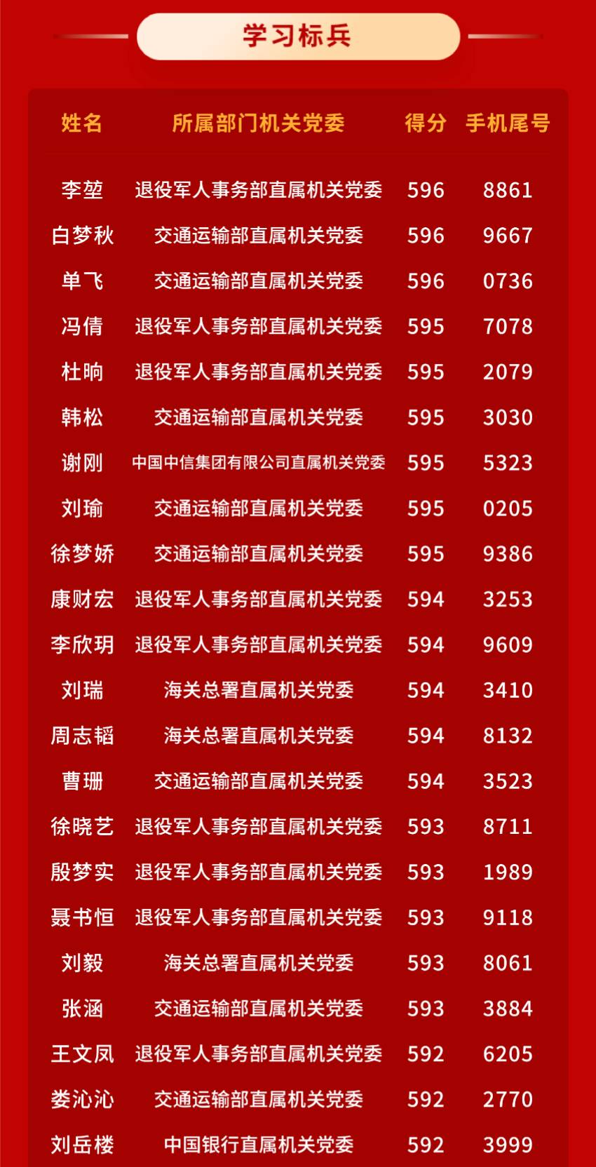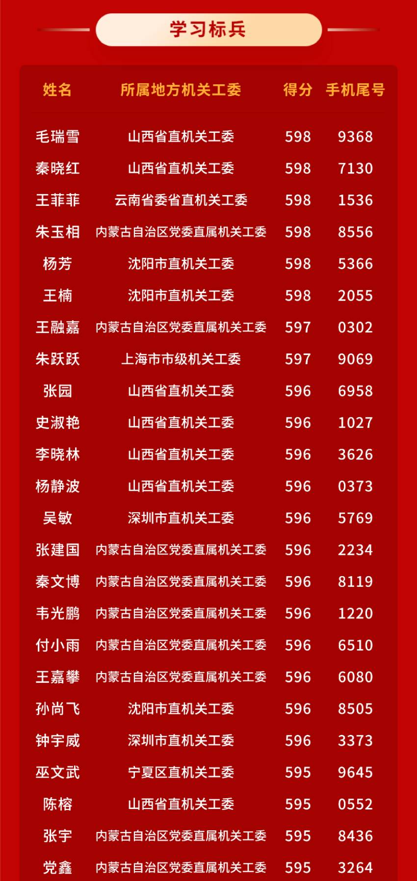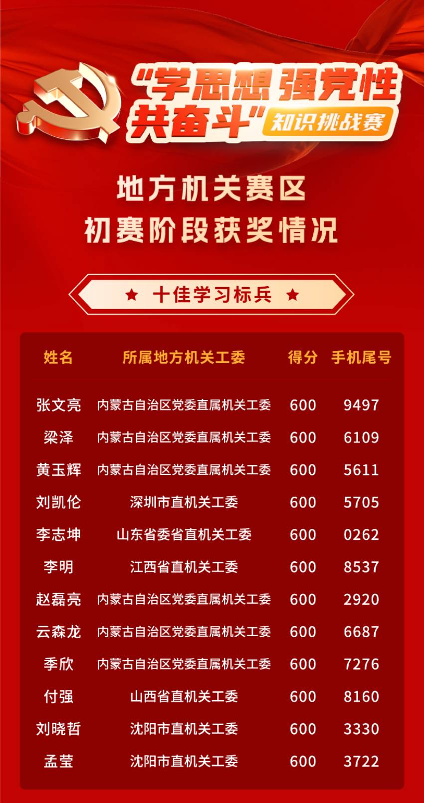 初賽階段已于6月9日順利結束,在線累計對局數超過1600萬場,參賽選手們積極踴躍、奮勇爭先,學習習近平新時代中國特色社會主義思想和機關黨建知識的氛圍日益濃厚,共有18名選手獲得了滿分成績。為鼓勵在知識挑戰賽初賽階段表現突出的參賽選手,根據《“學思想 強黨性 共奮斗”知識挑戰賽初賽階段獎項設置和獎勵辦法》,現將中央和國家機關賽區、地方機關賽區“十佳學習標兵”“學習標兵”獲獎名單通報如下: