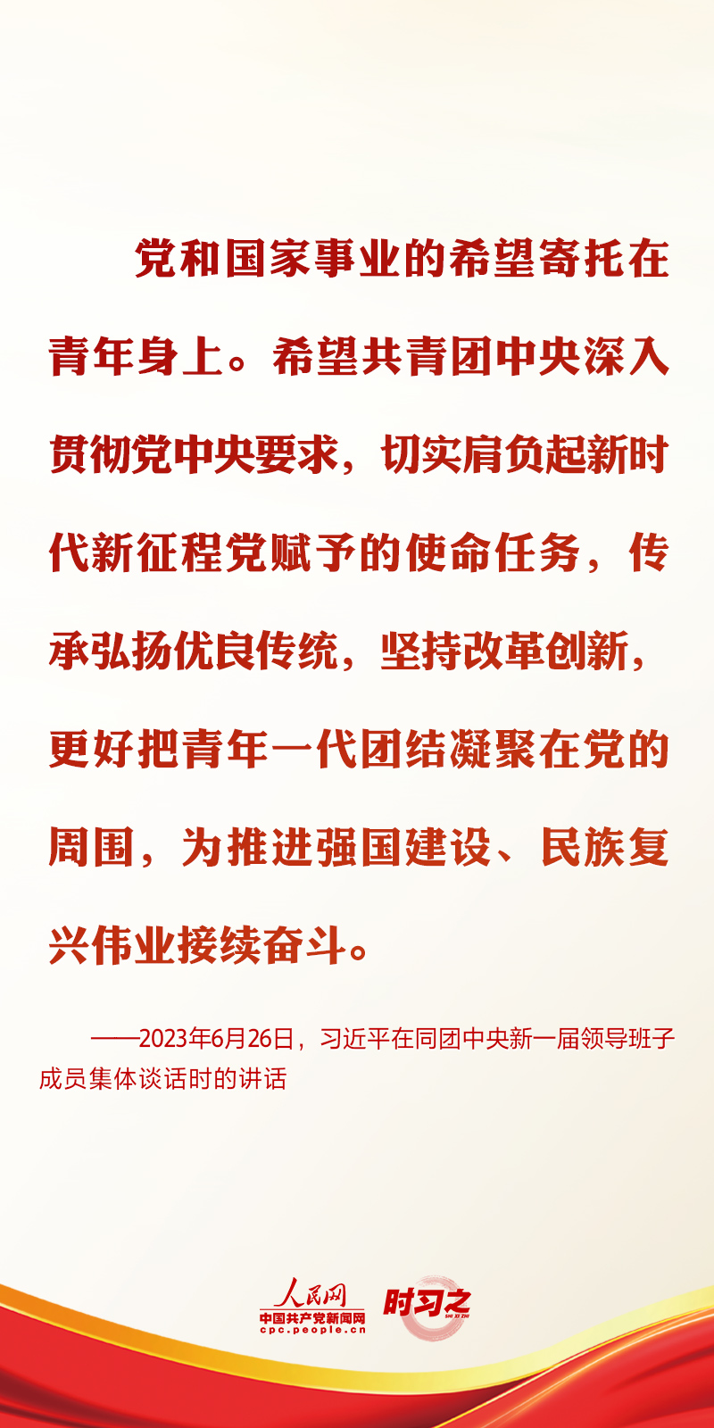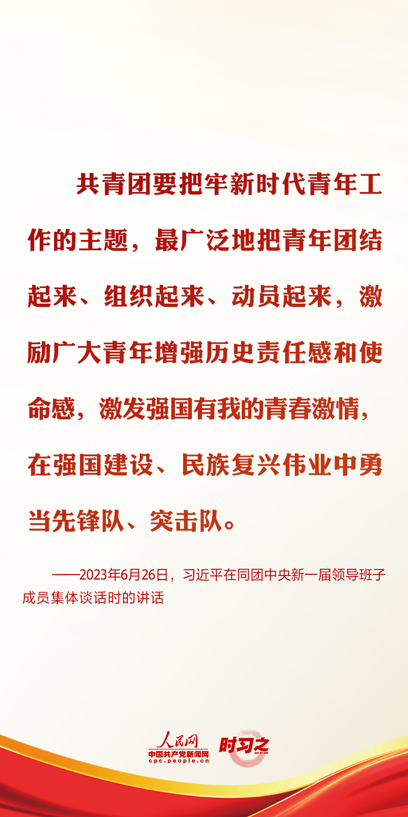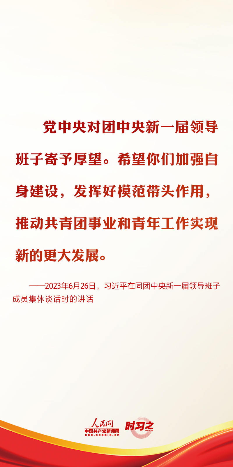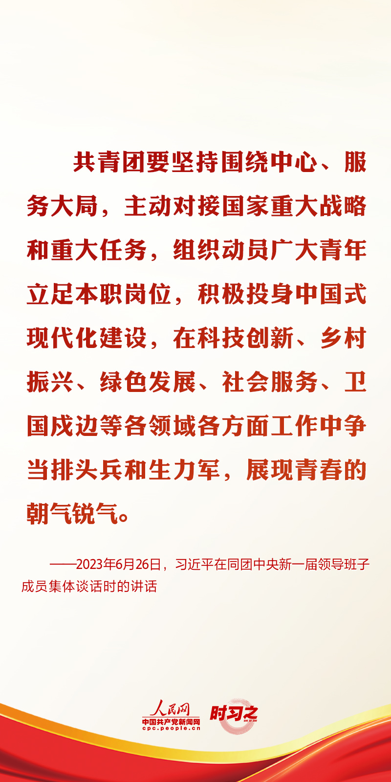2023年6月26日,中共中央總書記、國家主席、中央軍委主席習近平在中南海同團中央新一屆領導班子成員集體談話并發表重要講話。講話中,習近平總書記對共青團和青年工作提出了要求與希望。