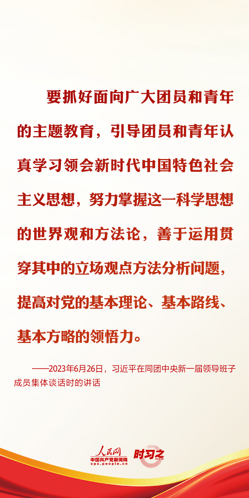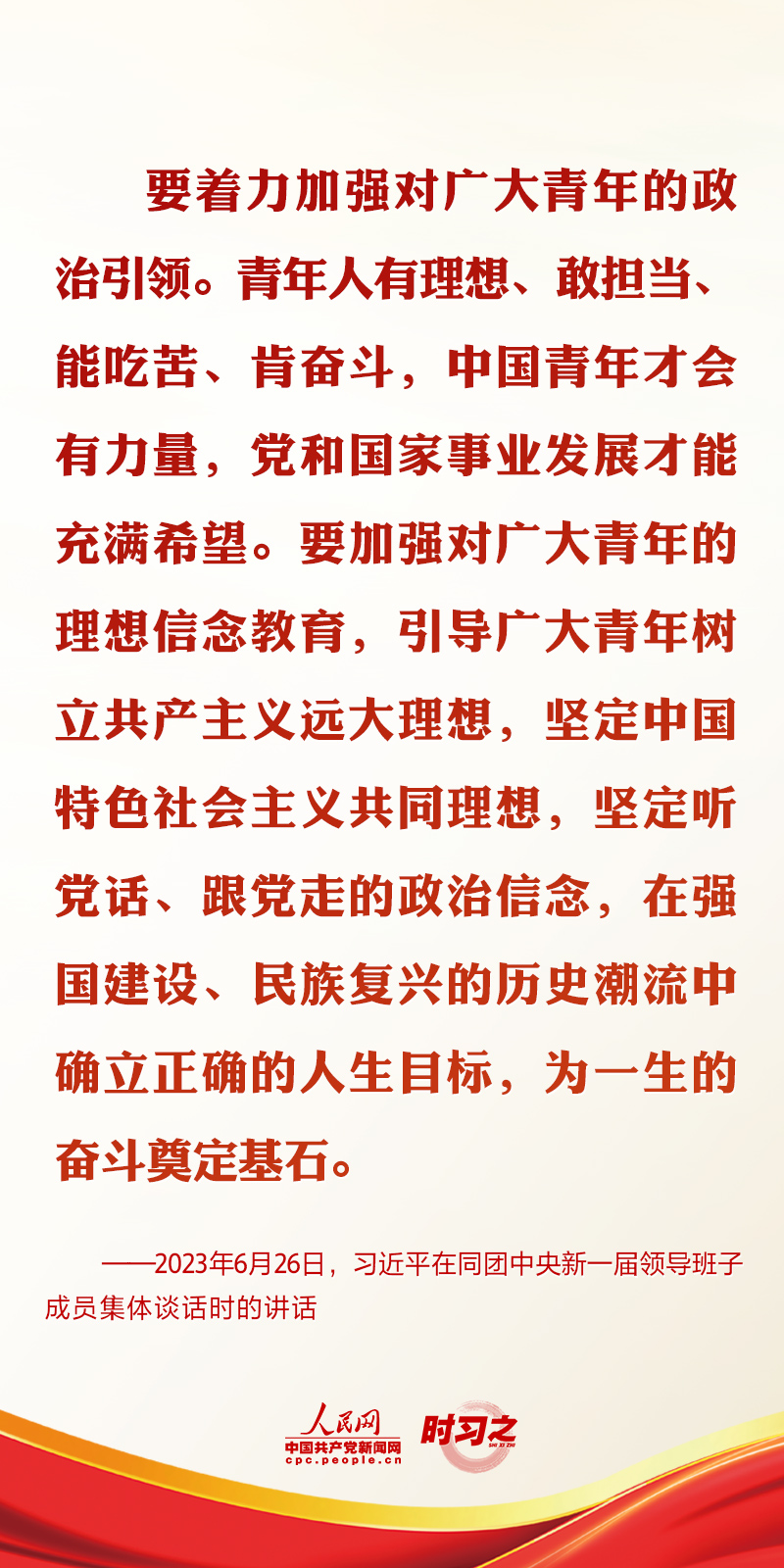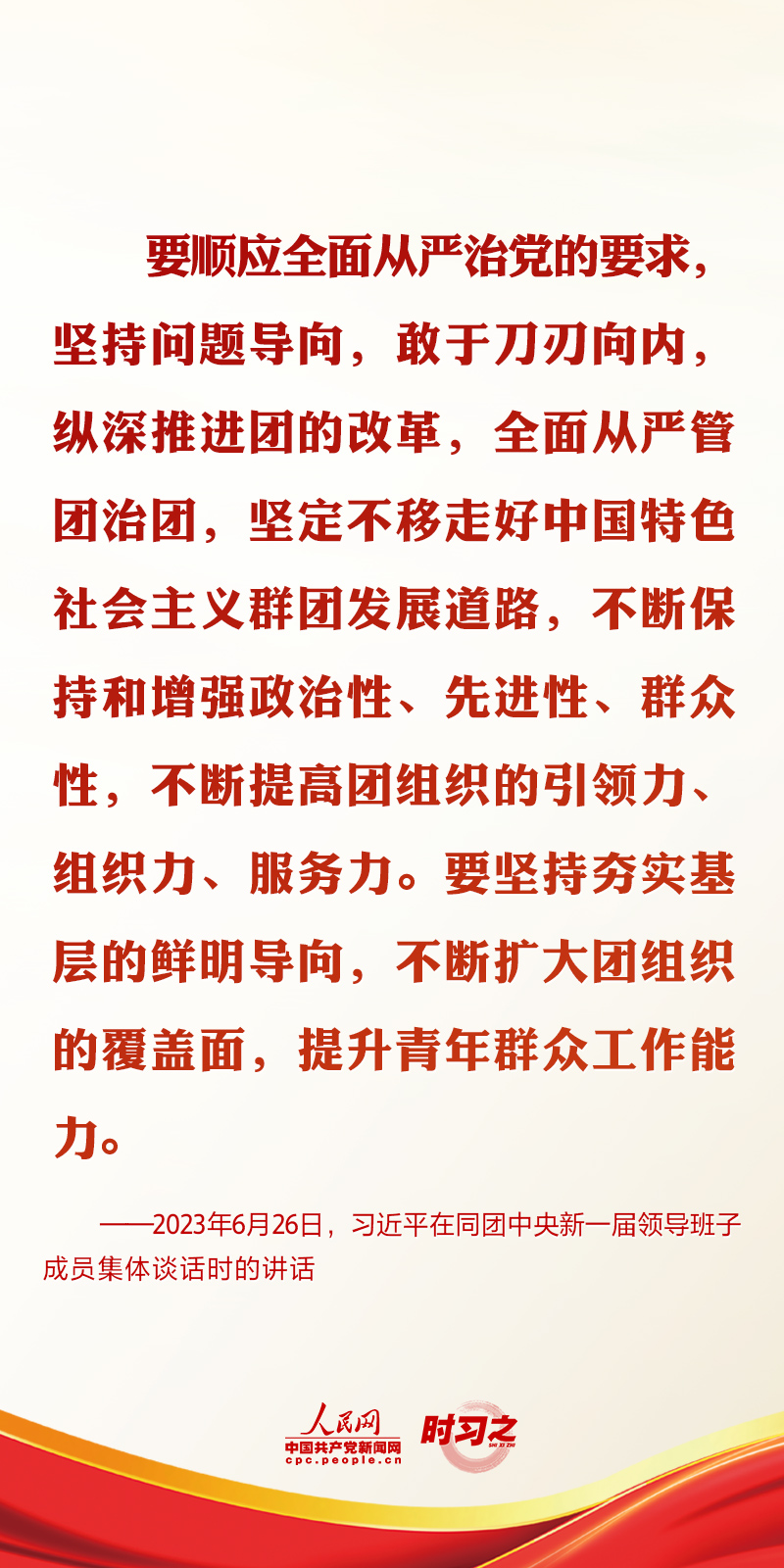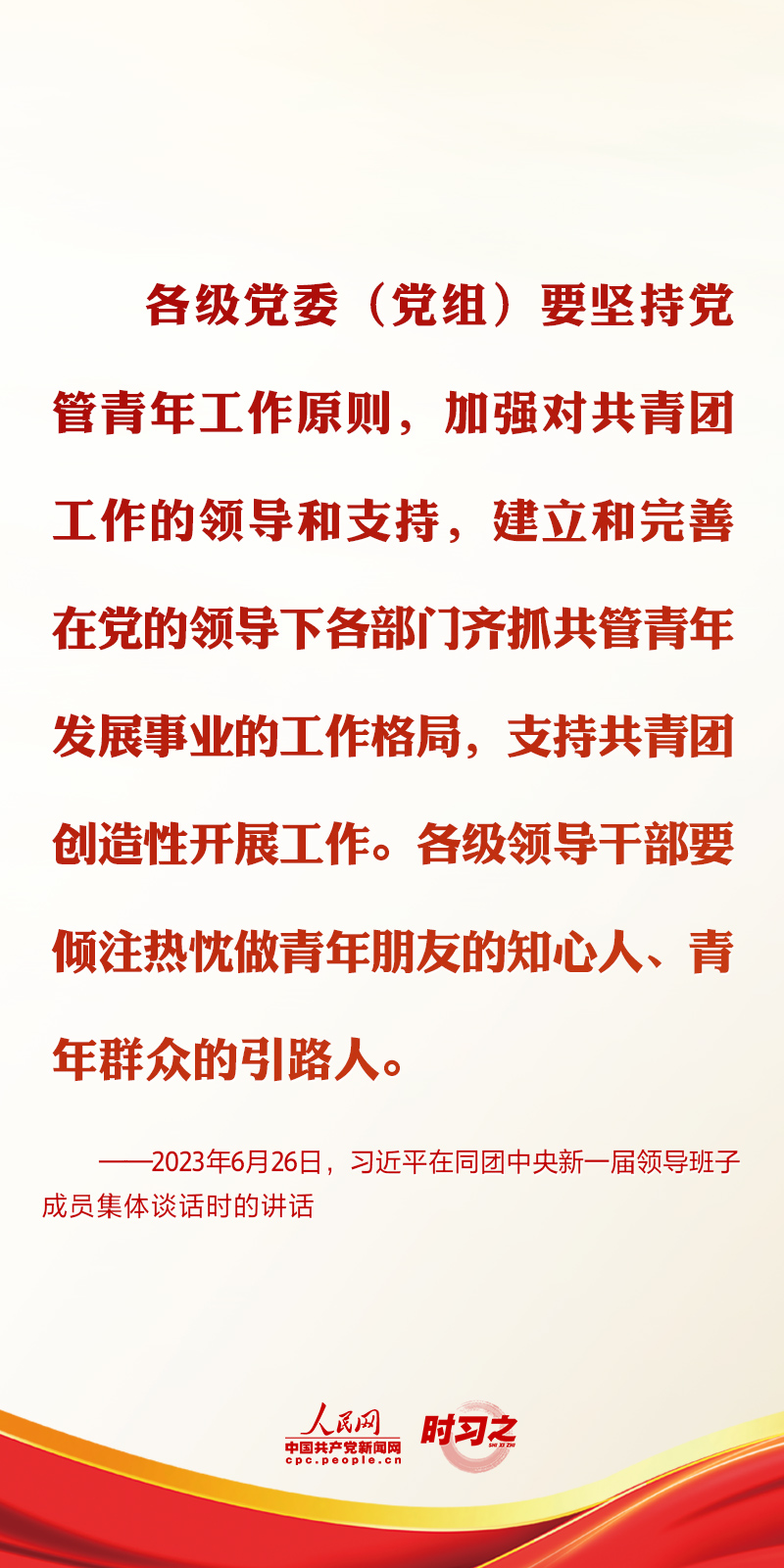 2023年6月26日,中共中央總書記、國家主席、中央軍委主席習近平在中南海同團中央新一屆領導班子成員集體談話并發表重要講話。講話中,習近平總書記對共青團和青年工作提出了要求與希望。