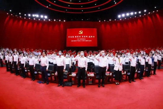 總臺各部門各單位主要負責同志和負責黨建工作的副書記,受表彰的總臺“四好”優秀黨員、“四強”黨支部、“年度黨建品牌”代表,新發展黨員代表在現場參加活動??偱_四址辦公區黨員、干部通過閉路電視收看活動直播,國內各地方總站黨員、干部通過視頻會議系統收看活動實況,并與活動現場同時重溫入黨誓詞。