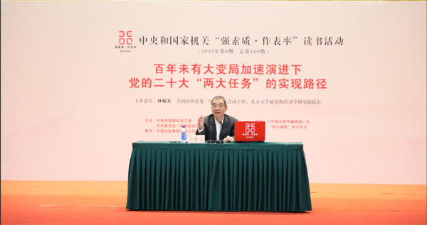 8月26日,中央和國家機關“強素質·作表率”讀書活動2023年第8期主題講座在全國政協禮堂開講。全國政協常委、經濟委員會副主任,北京大學新結構經濟學研究院院長林毅夫教授以《百年未有大變局加速演進下黨的二十大“兩大任務”的實現路徑》為題作講座。中央和國家機關各部門黨員干部近800人參加活動。