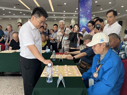 賽后,象棋世界冠軍、特級大師蔣川與獲得個人單項前十名的棋手進行了車輪戰表演。蔣川氣定神閑地在10名棋手之間來回踱步、輪番對陣。迎戰的老同志們也全神貫注、認真應對,盡情享受著和大師過招的機會?,F場精彩紛呈,引來陣陣喝彩。