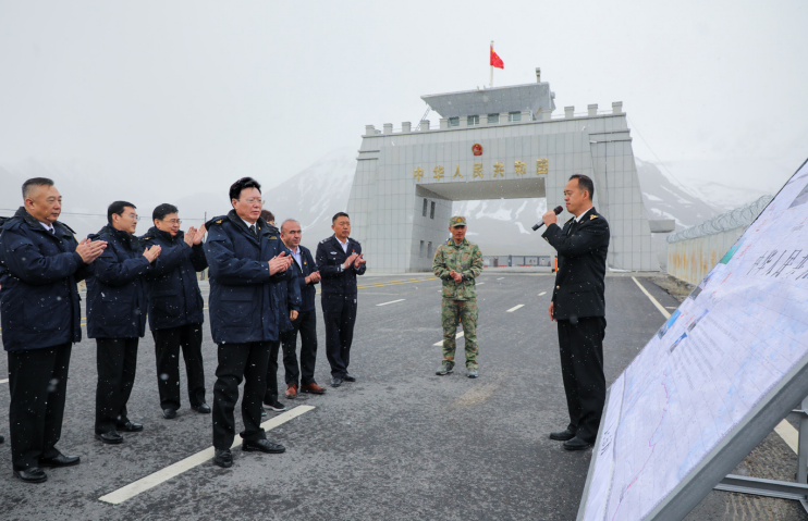 >> 7月12日,作者(左四)在紅其拉甫口岸調研并看望慰問一線關警員。