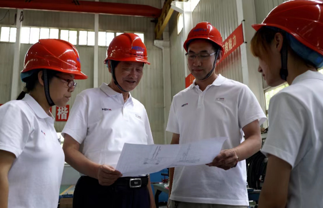 >> 由河北省組織的國家專精特新“小巨人”企業科技特派團與河北永明地質工程機械有限公司的工程師們在研究五千米鉆機的設計圖紙。