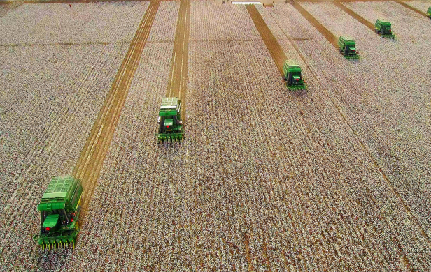 >> 新疆生產建設兵團第六師共青團農場的一塊棉田里,采棉機正在采收棉花。