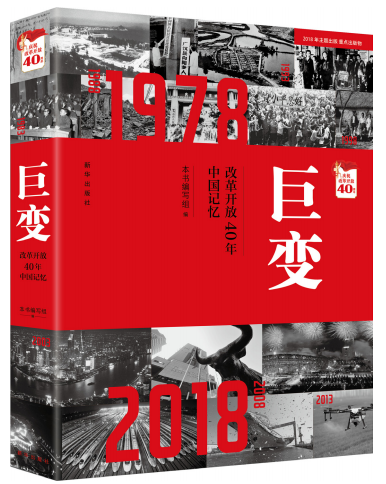 2018年,為慶祝改革開放40周年,新華出版社推出圖文精品圖書《巨變:改革開放40年中國記憶》?!毒拮儭肪x了新華社800多張反映改革開放歷史進程的具有典型意義的標志性事件、人物、細節的圖片。上編為城鄉變化,包括開放高地篇、鄉村變遷篇、城鎮變遷篇,選取了具有改革開放代表性的城市和村鎮,以點帶面,反映了中國城鄉巨變;下編為專題,包括經濟改革篇、科技創新篇、圓夢工程篇、社會民生篇、文化休閑篇、生態文明篇?!毒拮儭烦霭婧螳@多種獎項、榮譽,2023年榮獲“第八屆中華優秀出版物獎”。