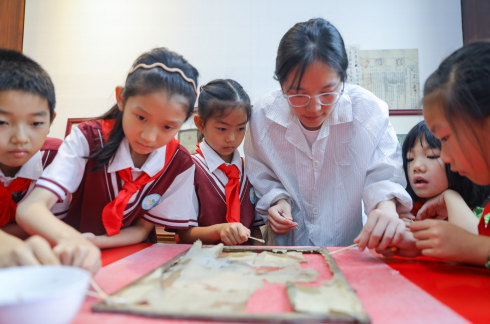 >> 2023年7月25日,山東省青島市第二實驗小學學生走進李滄區新時代文明實踐中心,開展了“文物無言 文明有聲”主題活動。圖為修復師指導孩子們體驗紗燈修復。