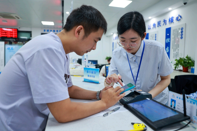 >> 8月16日,在江蘇省靖江市靖城街道為民服務中心,“辦不成事”服務窗口的工作人員在協助市民辦理靈活就業人員社保繳納。