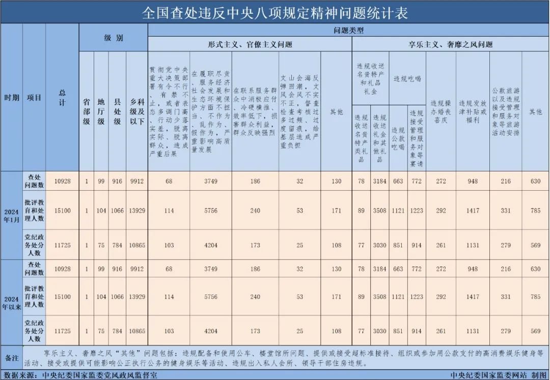 2024年1月全國查處違反中央八項規定精神問題10928起