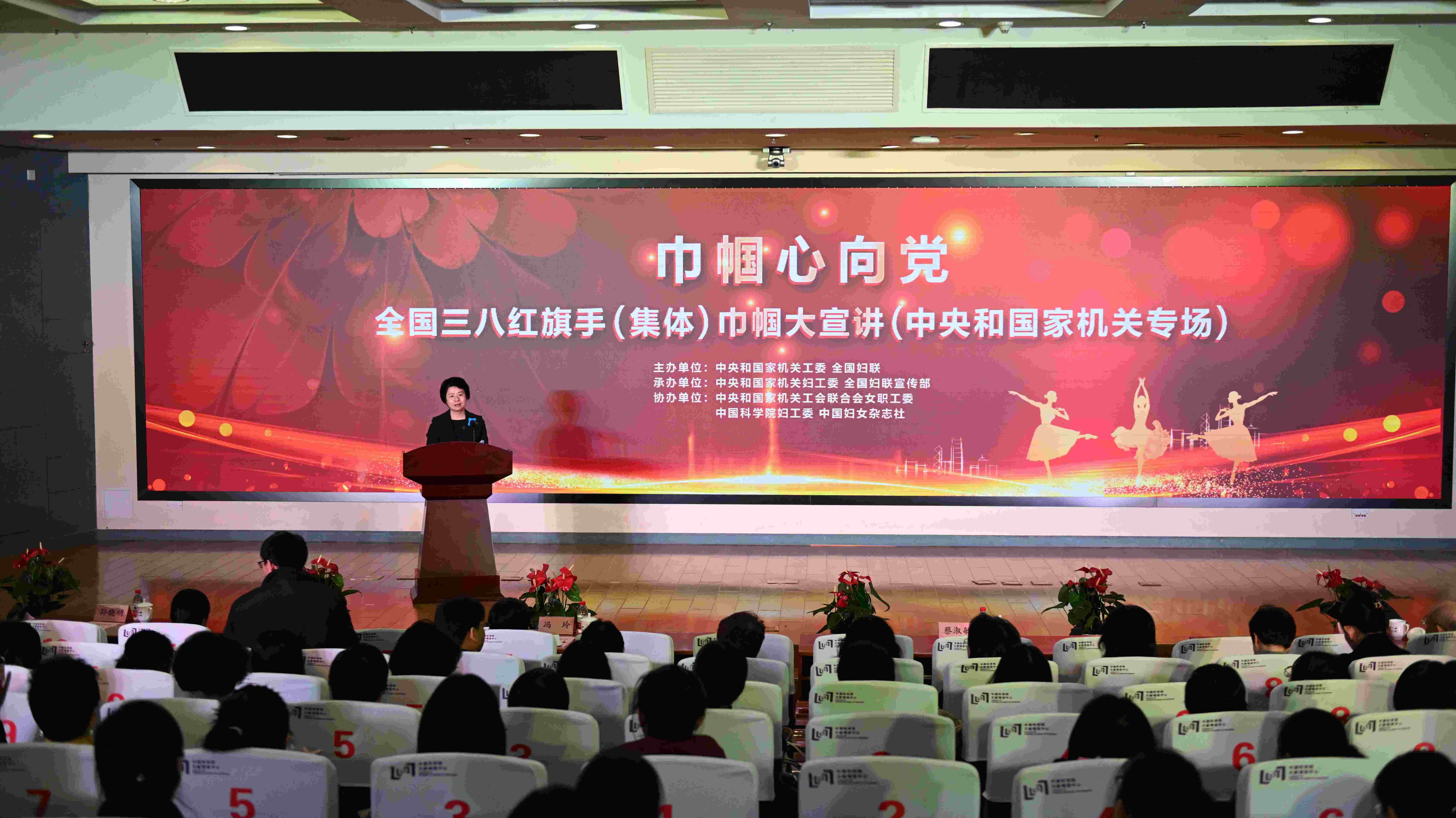 3月8日,中央和國家機關工委、全國婦聯舉辦2024年“巾幗心向黨”全國三八紅旗手(集體)巾幗大宣講(中央和國家機關專場)活動。中央和國家機關工委副書記蔡淑敏出席并講話。全國婦聯黨組成員、副主席馮玲,中國科學院黨組成員、副院長張亞平致辭。中央和國家機關各部門婦女組織負責人、女干部職工代表等約170人參加。