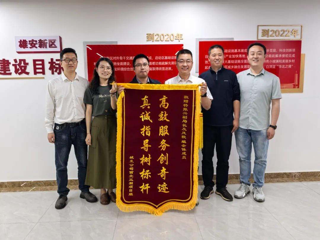 項目建設單位向楊振興(左三)團隊贈送錦旗。